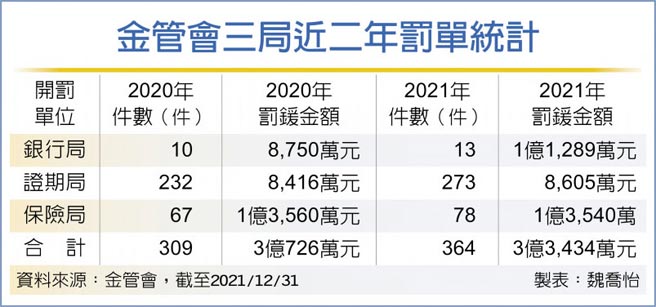 再細看2021年金管會所開出的3億3,434萬元罰單中,以保險局出手最重,累計全年開罰1億3,540萬元,其次爲銀行局,累計開罰1億1,289萬元,第三爲證期局開罰8,605萬元;三局合計開出364件罰單。