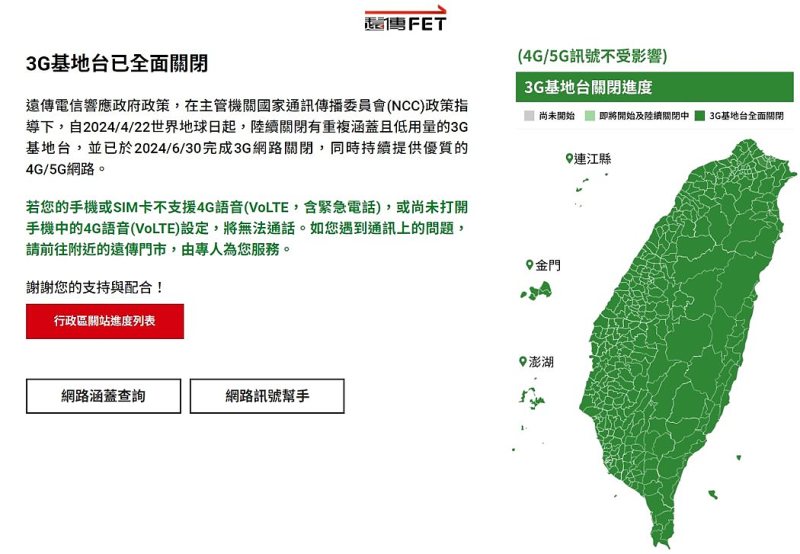 遠傳電信在官網也提到,6月30日已將所有3G網路關掉,圖示也相當明顯。(翻攝自遠傳電信官網)