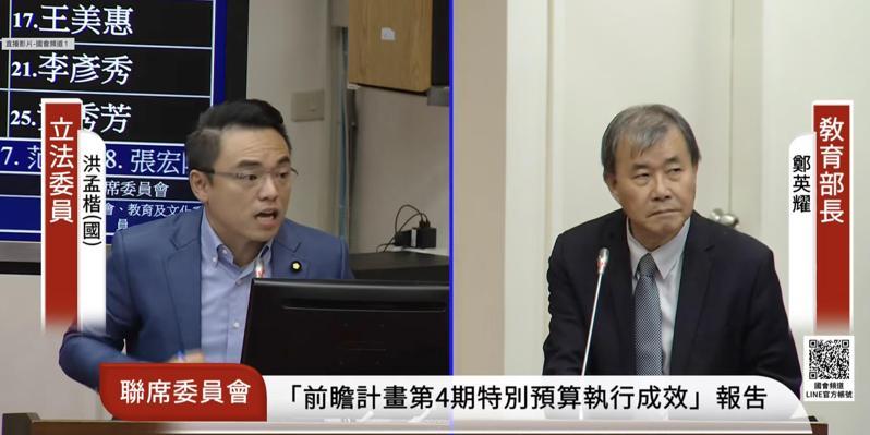 立法院財政等7個委員今聯席處理前瞻計劃預算。國民黨立委洪孟楷就國軍借用政治大學場地教召一事質詢,教育部長鄭英耀表示,大學可決定是否同意或拒絕,尊重大學治理和權責。圖/截自立法院議事直播
