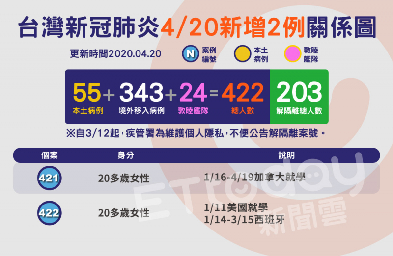 中央流行疫情指揮中心今(20日)公佈國內新增2例新冠肺炎(COVID-19)境外移入病例(案421、422),都是20多歲女性。其中一例在1月16日赴加拿大就學,4月19 日返國確診。