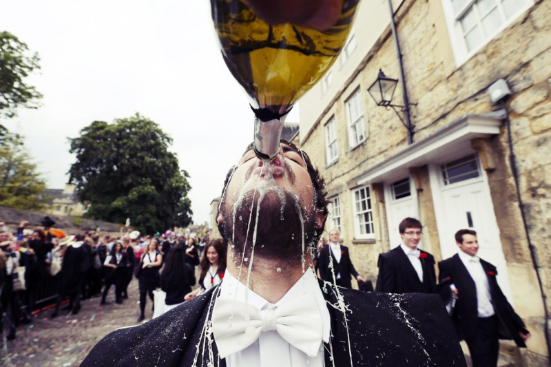 許多英國民衆認爲,95%的牛津大學學生都是來自學費高昂、菁英家庭專屬的私立中學,顯示了英國社會對於菁英大學懷抱着高不可攀的想像。圖爲牛津畢業傳統的「get trashed」。 圖/路透社