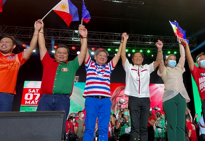 菲律賓總統小馬可仕扶貧顧問賈登(左3)因以污言穢語辱罵一名女記者,遭大法官全數表決通過,撤銷他的律師資格。圖爲賈登於2022年5月7日出席時爲總統候選人的小馬可仕造勢大會。(圖/中央社)