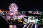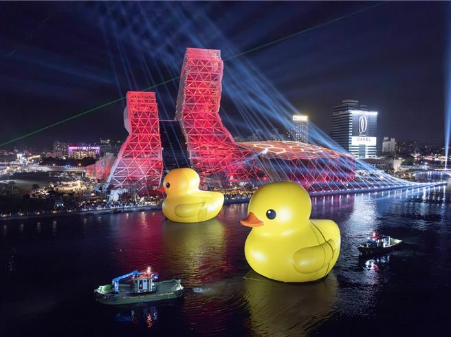 春節期間黃色小鴨搭配高雄流行音樂中心紅色燈光。(高市觀光局提供)