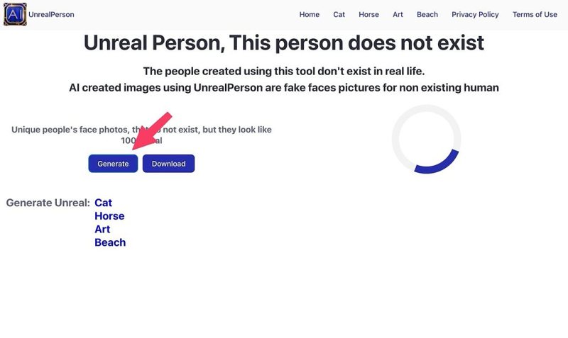 從首頁還能選擇要產生的其他非真實照片,包括:貓咪、馬、藝術照和海灘,使用方法相同,點選產生就會在幾秒鐘內生成照片,點選下載即可取得圖片檔案。
