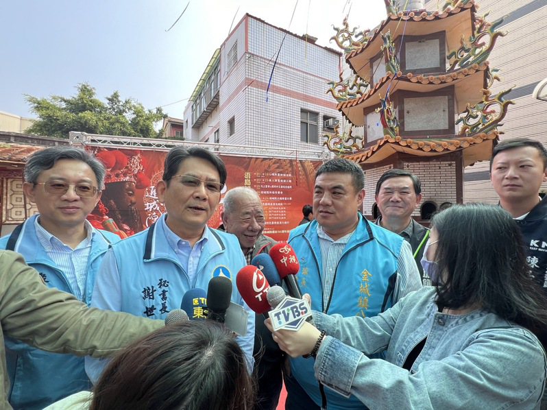 縣府秘書長謝世傑(左二)、觀光處長許績鑫(左一)、金城鎮鎮長李誠智、金城鎮代會主席郭永隆、浯島城隍廟主委楊耀芸等人共同宣佈,迎城隍活動自4月20日起接下來一個月,每週都會有不同的活動。記者蔡家蓁/攝影