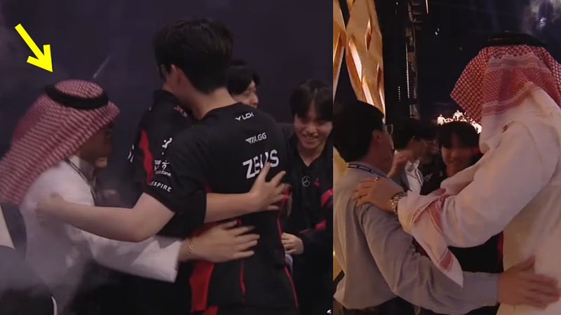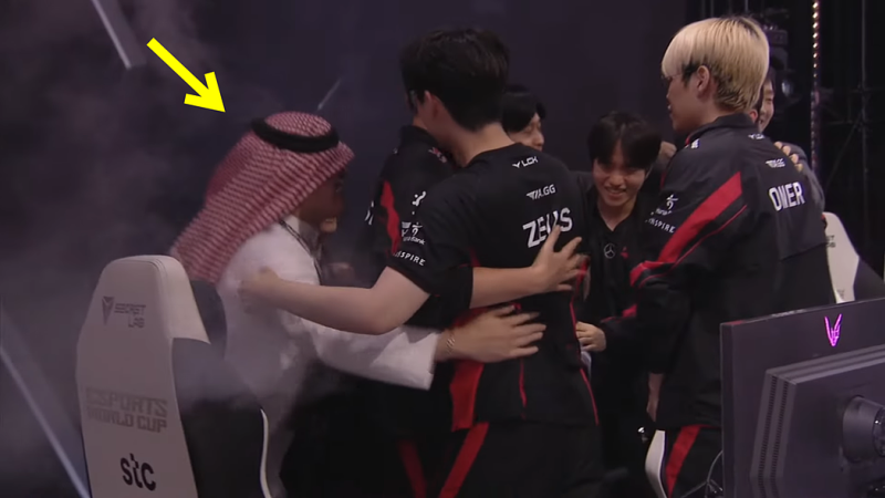 值得一提的是,在 T1 確定奪下石油杯冠軍後,教練、後勤人員紛紛衝上舞臺和選手們相擁慶祝。此時眼尖的觀衆們發現,怎麼有一個穿着阿拉伯傳統長袍的男子也跟着上臺,還和 Zeus 抱在一起?直播當下的聊天室也刷起了一片,「那個男人是誰」、「怎麼有頭巾男亂入」、「怎麼有石油王子跑出來」。