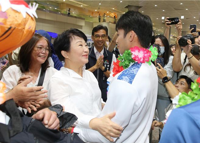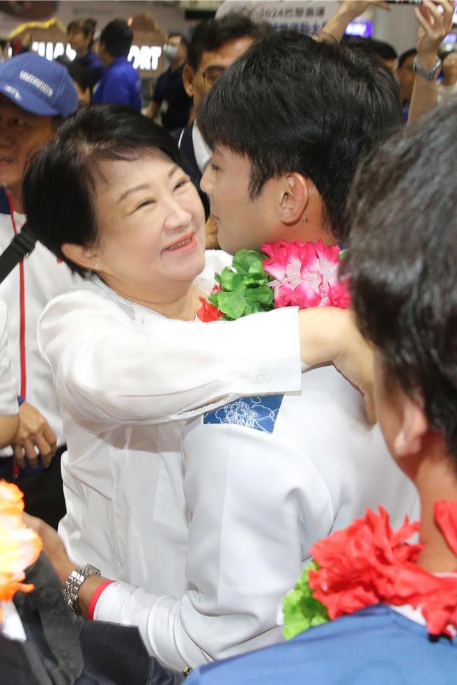 臺中市長盧秀燕也特別到場,獻上「愛的抱抱」,歡迎臺中選手楊勇緯返臺。(陳麒全攝)