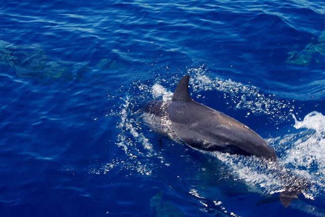 鯨豚會成羣結隊的跟在漁船後面,趁魚羣被「集魚燈」聚集時,在後方跟緊的吃下漁民正在捕撈的魚獲。(許家寧攝)