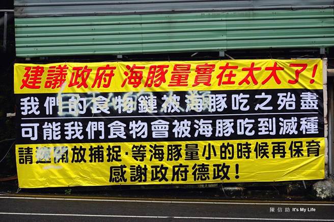 有民衆發現深澳漁港有一幅巨型海報上指出,鯨豚量太多,影響食物煉,魚獲會被吃光。(環保志工陳信助提供/吳康瑋新北傳真)