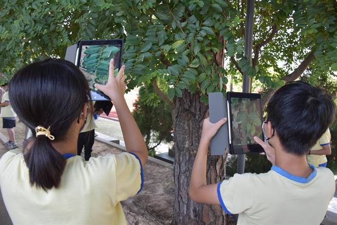 頭份市僑善國小學生利用平板電腦來識別植物種類。(謝明俊攝)