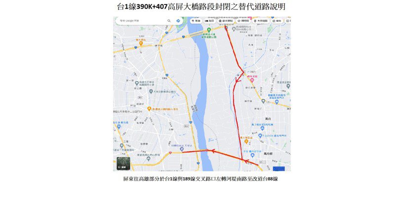 公路局提醒,施工期間屏東往高雄部分在臺1線與189線交叉路口左轉河堤南路至改到臺88線。圖/公路局提供