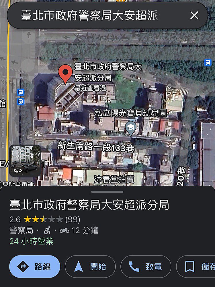 臺北市警察局大安分局的Google Maps名字,被惡意修改成「臺北市政府警察局大安超派分局」。圖/擷取自Google Maps