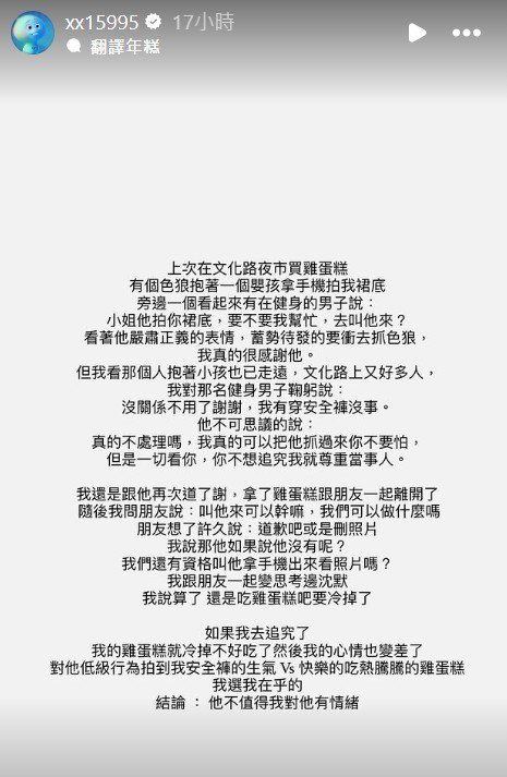 雖Yuri選擇放過色狼,不過她強調,「戰起來我一定不會輸,但這個時間和精力,我寧可再去排隊買一份雞蛋糕。」
