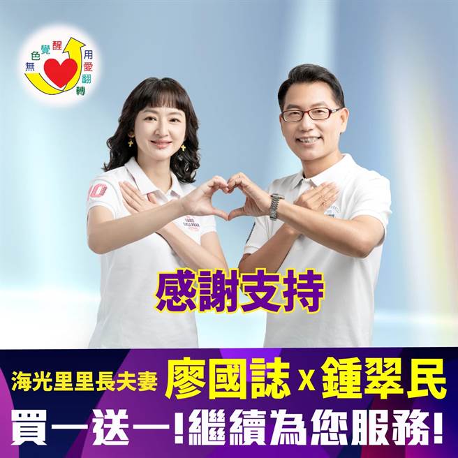 原本連任2屆海光里長的廖國志去年底參選高市議員未能當選,這次回鍋參選里長,最後如願當選,妻子鍾翠民高興地在臉書PO文,並貼出高市府祝賀「高票當選」的紅色海報喜訊,不少里民也獻上祝福。