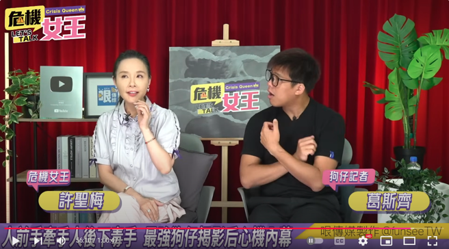 資深媒體人許聖梅、狗仔葛斯齊,昨(16日)晚間在網路節目《危機女王》爆料演藝圈不爲人知的八卦,吸引大批粉絲吃瓜。許聖梅透露有名大咖男星「很帥、很有魅力」,但因惹怒計程車司機,來臺買春的行蹤才被泄漏。