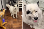 大陸網友說,主人帶着這隻六個月大的薩摩耶到工廠辦事情,廠區負責人說狗狗可以在工廠內自由活動,於是主人也沒多想便放牠自由玩耍,沒想到開完會兩個小時後,他到處找不到自己的薩摩耶,這時,忽然角落傳來狗吠,他定睛一看才發現,自己的薩摩耶居然變成小黑炭了!