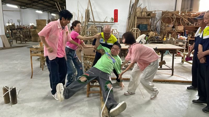 接着蔡大哥帶大家去剖竹子,要使用特殊的刀具把竹子剖成均勻竹片,這些全都要手工來完成,接着要透過燻烤的方式把竹子烤軟凹彎,馬上泡冷水定型,用這樣的方式做成各種造型的竹編,沒想到竹子在烘烤的過程中,因爲竹子會頻頻發生爆炸,嚇得籃籃及繡惠姊是尖叫連連!直呼這個工作實在太恐怖了。