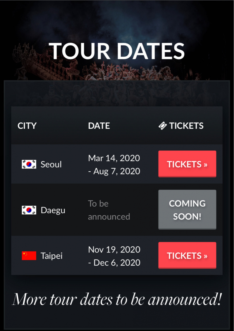 百老匯音樂劇《歌劇魅影》將在睽違6年後,第四度來臺演出,將於11月底開始在臺北小巨蛋演出22場。有網友18日發現,在官方世界巡演日程表中,將展演城市「臺北」前方放置了「五星旗」,引發熱議。不過在19日上午,官網已將「五星旗」換上中華民國國旗。