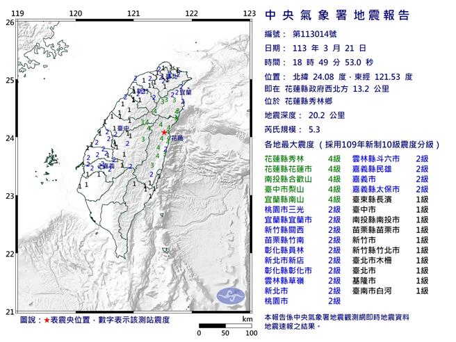 據中央氣象署地震報告,秀林鄉今晚6時49分許發生芮氏規模5.3地震,地震深度約20.2公里,其中,秀林鄉與花蓮市區震度達4級,突如其來的劇烈搖晃嚇壞不少民衆,紛紛在臉書、line等社羣上分享,引起熱烈討論。