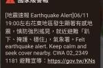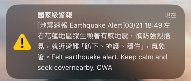花蓮縣秀林鄉今晚約6時49分許發生規模5.3淺層地震,不少民衆均收到國家級警報通知。(摘自手機畫面/羅亦晽花蓮傳真)