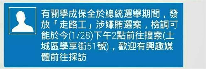 此外,各家媒體今日也收到一封簡訊上寫明「有關學成保全於總統選舉期間,發放走路工涉嫌賄選案,檢調可能於今日下午2點前往搜索」,黃永昌則說,檢調不公開,「藏鏡人」主動通知記者似乎有些過分。
