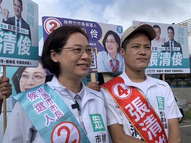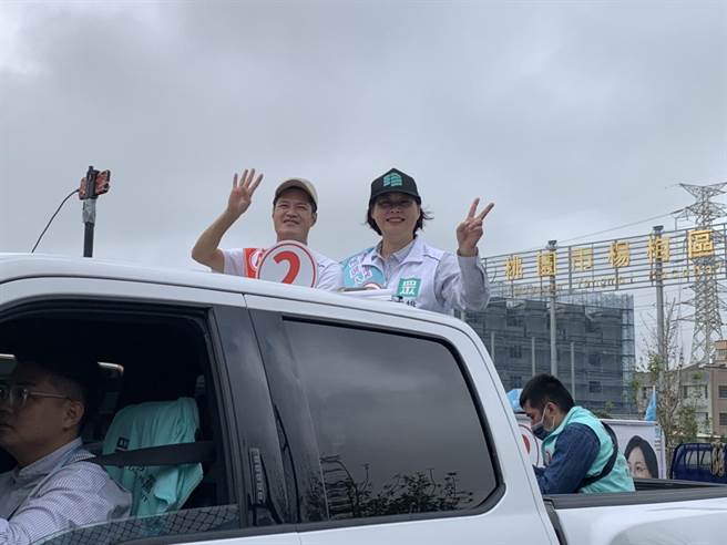 民衆黨桃園市長候選人賴香伶(左)今早車隊掃街從楊梅區出發至桃園區。(蔡明亙攝)