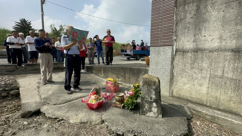雲林縣二崙鄉三和村深坑社區早年開墾因緊鄰新虎尾溪,時常因大雨致災,居民爲此在溪邊設立「石敢當」每年祭拜溪王,成爲當地特有的「溪王祭」民俗活動,今天近百村民準備豐盛供品祭拜溪王。記者陳雅玲/攝影