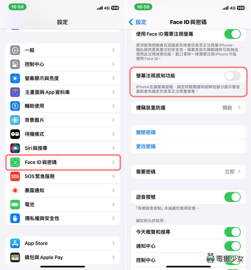 進到 iPhone 中的「設定」>>「Face ID 與密碼」,並將「螢幕注視感知功能」關閉,這個功能會使 iPhone 在螢幕變暗、鎖定時展開通知,或降低部分提示聲音量前,會先確定你是否正注視着螢幕。「螢幕注視感知」預設是開啓的,有可能一早鬧鐘響拿起 iPhone 時,Face ID 剛好對到你還沒清醒的臉,因此自動降低鬧鐘的音量,導致繼續昏睡沒聽到鬧鐘這樣。