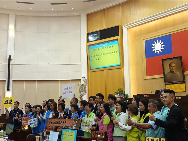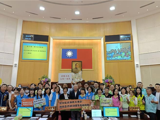 今日彰化縣議會第20屆第5次定期會議程三讀通過彰化縣政府農業處提出的「彰化縣石虎保育自治條例」,條例通過後,縣長王惠美以及藍綠兩黨議員手持標語合照,象徵彰化縣在石虎保育上前進一大步。