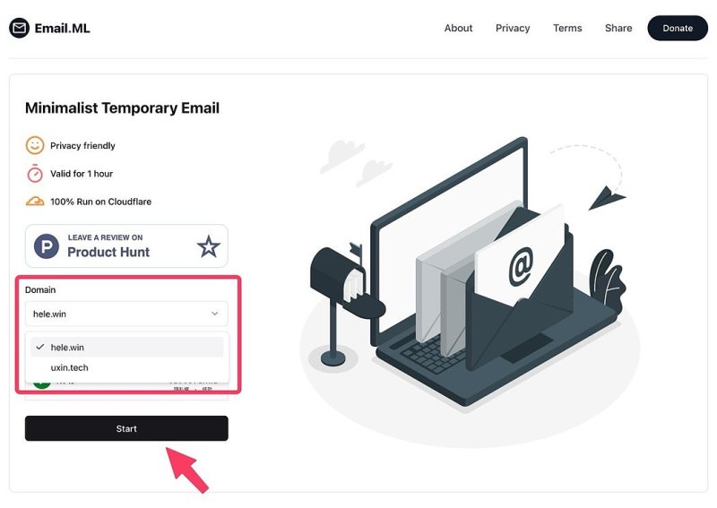 進入 Email.ML 後點選「Start」就能取得一個臨時的郵件地址,可以透過它接收郵件,不過和其他的暫時信箱服務一樣沒有提供寄件功能。