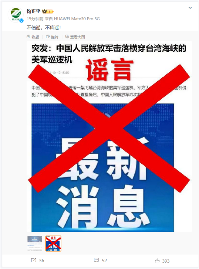12日晚,鈞正平工作室官方微博「@鈞正平」發佈圖文消息指出,所謂「中國人民解放軍擊落橫穿臺灣海峽的美軍巡邏機」的消息系謠言,並強調「不信謠,不傳謠!」