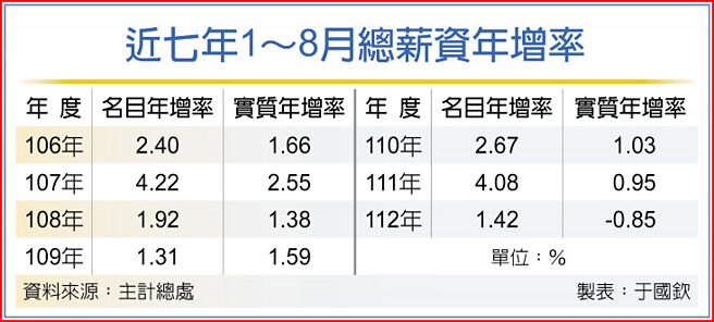 在薪資方面,1~8月名目總薪資年增率1.42%,經消費者物價指數平減後,實質總薪資年減0.85%,比前一次(1~7月)年減0.68%再擴大,陳惠欣表示,這是出口疲弱,廠商發放績效獎金保守所致,研判9月份外貿、通膨這兩項因素仍將影響勞動市場。