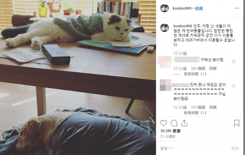 具惠善3日在IG發文,PO出家裡寵物的照片,對於外界心疼她還是守着這段破碎婚姻,她也坦白說出不願意離婚的真正原因:「和我共度更多時間的『我的寵物』,連一次給飯或清尿便都沒有的人,通知說要離婚就直接要把牠們帶走,所以我沒辦法離婚。」