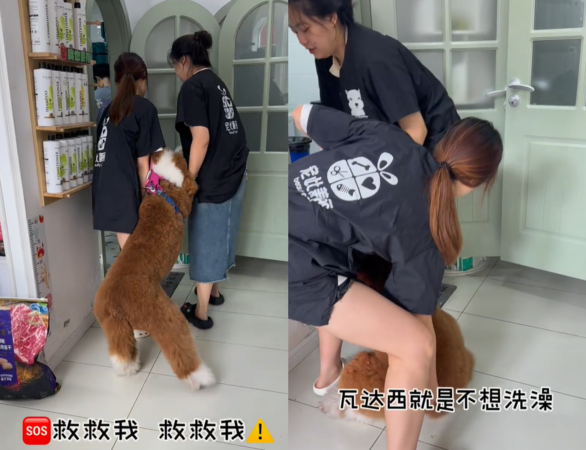 巨型貴賓到美容院就剎車 被架走全身抵抗:我不要洗澡!