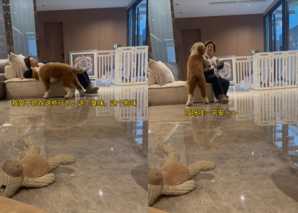 飼主分享,其實剛帶平安回家時媽媽非常反對,總是各種嫌棄,有一次他便拍下平安跟媽媽的搞笑互動,只見媽媽慵懶地躺在沙發上,嘴裡嫌棄着「我受不了這些行爲、這個臭味、這個狗味」,下一秒卻主動擼狗一邊喊着「平安啊~平安!」現在媽媽不只會遛狗,根本把平安寵上天了。