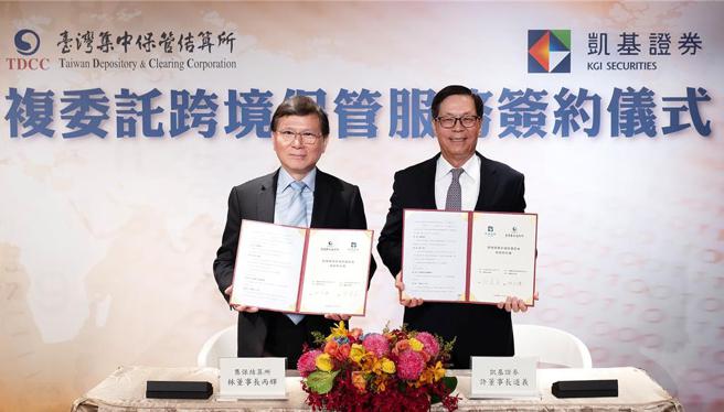 凱基證券成爲首家復委託業務可委託國內集保之券商,由凱基證券董事長許道義(右)與集保結算所董事長林丙輝代表簽約。圖/凱基證券提供