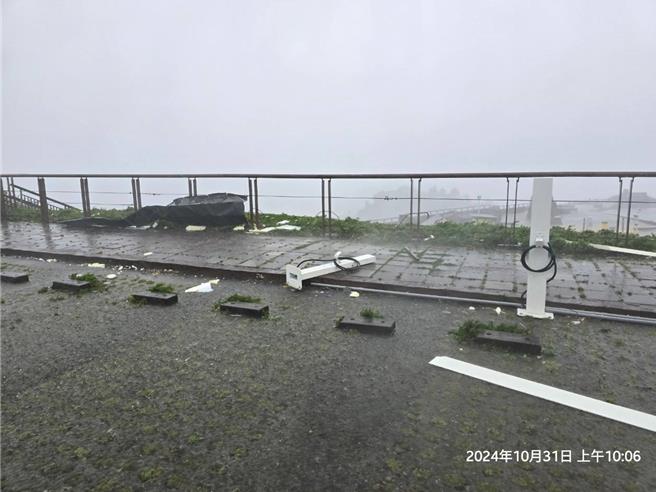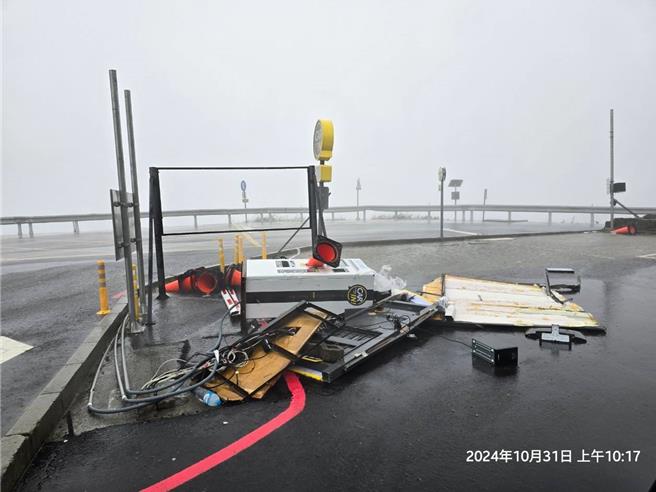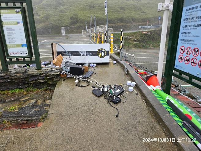 康芮颱風在合歡山刮17級強風,武嶺停車場不僅繳費亭被吹趴,停車場設施也受損。(林保署南投分署提供/楊靜茹南投傳真)