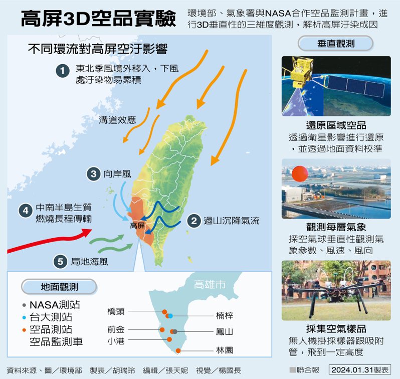 爲了解高屏地區空氣污染成因及不同環流對空品的影響,環境部與交通部氣候署、美國國家航空暨太空總署(NASA)合作啓動高屏3D空品實驗,透過探空氣球、無人機等方式,取得垂直空間資料,讓空品觀測從過往的2D點對點的平面資料,改爲3D,找出中南部地區空品較差的原因,進而提出防治作爲。
