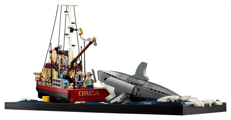 而在這組《大白鯊》套裝組中,包含電影中出現的「逆戟鯨號」 (Orca),以及電影角色警長馬丁·布羅迪 (Martin Brody)、海洋生物學家馬特·胡珀 (Matt Hooper),以及鯊魚獵手薩姆·昆特 (Sam Quint),另外也包含電影中出現的魚叉、浮筒等。