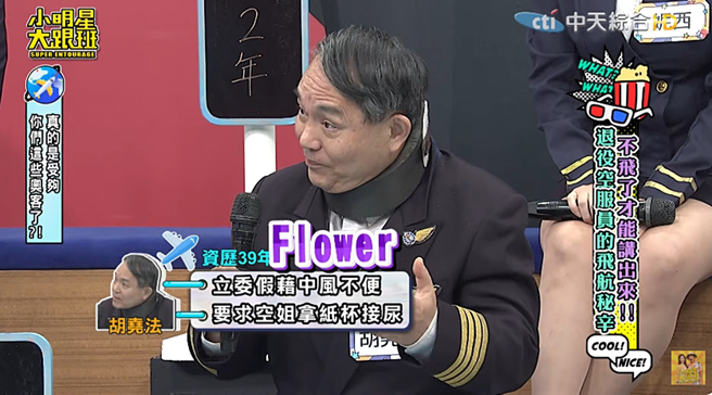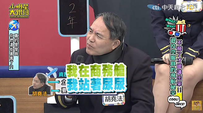 名人搭飛機的怪事時有所聞,最近《大明星小跟班》邀來一羣退役空服員,爆料工作多年看過各種乘客的奇葩行爲。其中,一位資歷39年的機長鬍堯法分享,曾遇過一位立委搭機自稱中風行動不便,堅持要在商務艙拿紙杯尿尿,還要求空姐幫他扶「那話兒」。胡堯法看不過去出手自願幫忙,結果那位自稱中風的立委頓時「不藥而癒」。