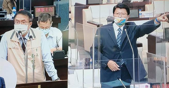 臺南市議員謝龍介(右)揭露說,這3個多月來,許多領不到紓困金的社會邊緣戶,不斷到藍營議員的服務處求救借錢;市長黃偉哲(左)承諾會認真去找社會安全網的漏網之魚。(臺南市議會提供/洪榮志臺南傳真)