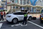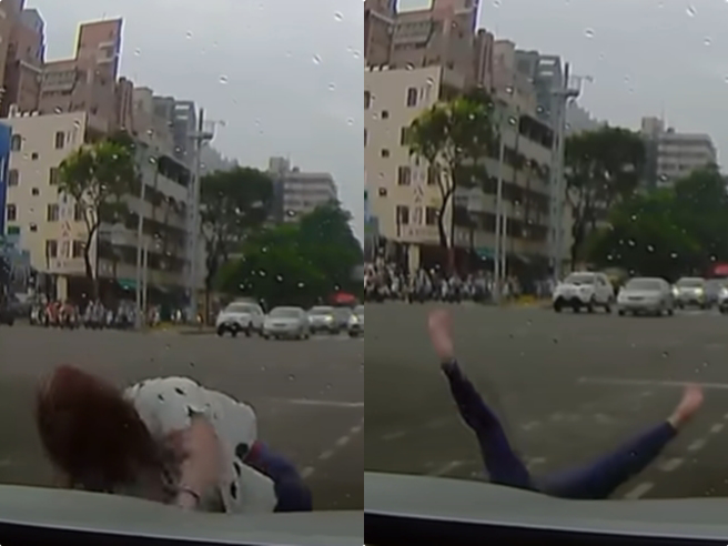 1名女騎士日前在大馬路口待轉區等紅燈時,因突然想到要回公司拿手機,竟直接違規逆向騎在斑馬線上,以爲能趁紅燈時騎到馬路左側,沒想到騎到半路變爲綠燈,她即遭一輛正準備起步的轎車撞飛,當場四腳朝天、雙腿呈現YA字形,影片曝光標題稱「突然就被秀了一波風車」。