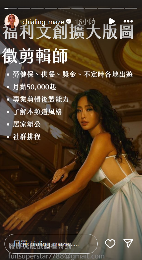 ▲薔薔釋出徵才訊息。(圖/翻攝自IG/chialing_maze)