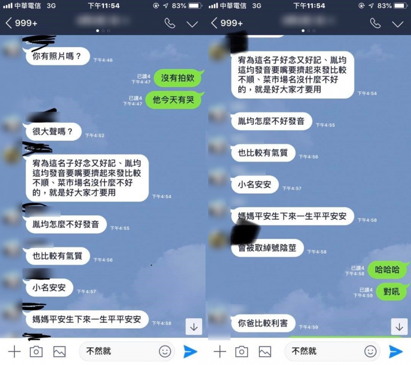 一位網友在臉書社團「爆笑公社」貼出家庭羣組對話,他表示因爲要幫兒子取名,就挑了幾個給爸媽選。爸媽對於其中兩個名字「宥爲」和「胤均」各持己見,爸爸認爲前者好念又好記,後者嘴巴要「擠起來」,發音較不順,「菜市場名沒什麼不好,就是好大家纔要用」。但是媽媽卻認爲「胤均」比較有氣質,還表示「怎麼不好發音?」,堅持就是喜歡這個名字。
