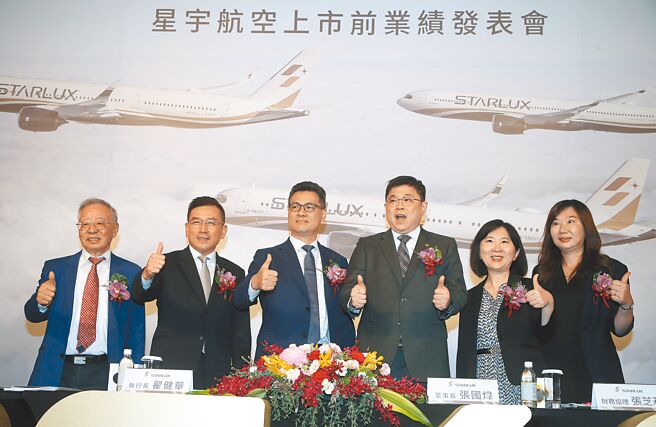 星宇航空25日舉行上市前業績發表會,董事長張國煒(右三)率經營團隊成員一起亮相。(劉宗龍攝)