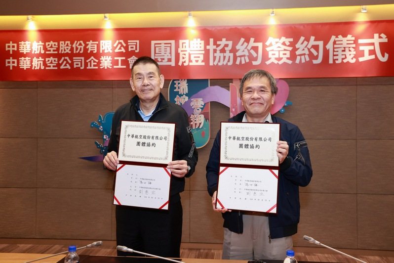 現年73歲的華航董事長謝世謙(左)今驚傳心肌梗塞猝逝,昨才與工會簽訂團協。圖/華航提供