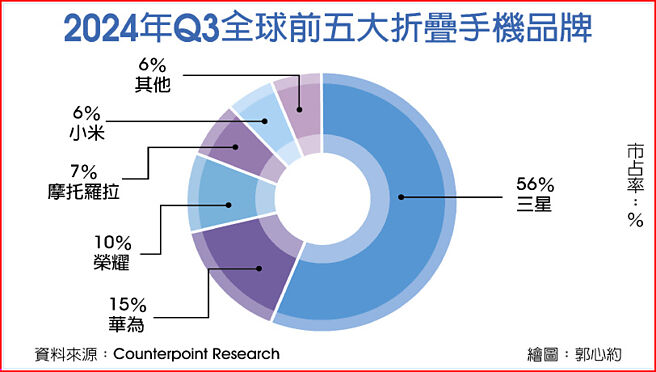 市調機構Counterpoint Research稍早發表報告指出,全球摺疊手機出貨量在連續六季年增率正成長後,於2024年第三季首次出現年增率下跌,年減1%。這也是該市場有史以來第三季首次出現衰退,主因爲三星新推出的Galaxy Z6系列表現不如預期。當季,三星摺疊手機的全球市佔率達56%,排名第一。中國企業華爲以15%市佔率,排名第二。