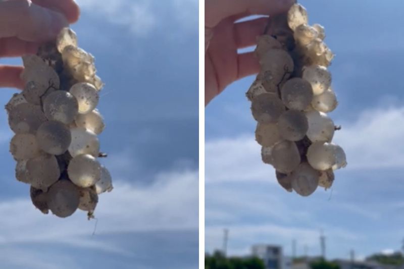 最近一段影片在網路上瘋傳,一名網友在海邊撿到了一串透明的海葡萄,全部透明的模樣讓不少網友熱議這到底是什麼,沒想到答案讓不少網友相當驚訝。 (圖/取自影片)
