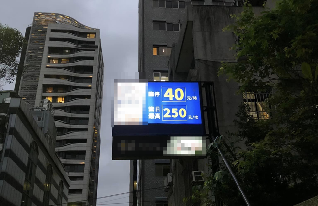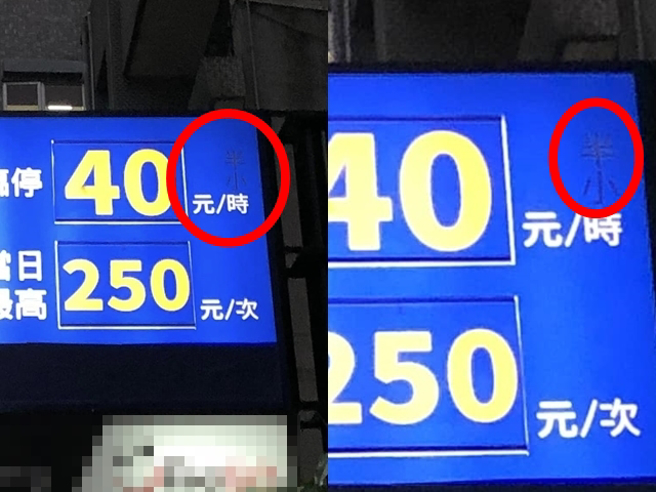 該名女網友在臉書「路上觀察學院」分享圖片,她在臺北市區發現一處停車場的招牌寫着「臨停40元/時」和「單日最高250元/次」,不過後來她仔細看招牌,發現「40元/時」的上方有黑字寫着「半小」,不過黑字在深藍色的招牌上相當不易辨識,實際上應是80元/時。