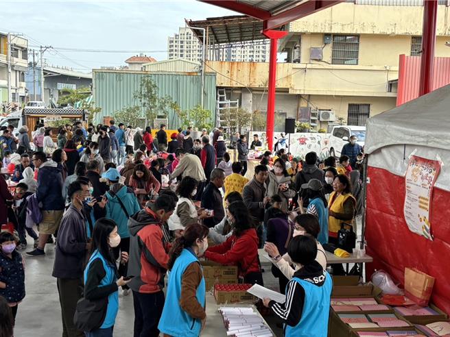 臺南市草湖寮代天宮與安南區公所首次聯手,18日在廟埕舉辦送春聯活動,現場提供美食與福袋給參加居民,吸引親子家庭約500人同樂。